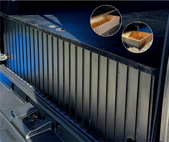 • A wooden deck with black metal railing, showing a power sander on the floor and an inset of a wooden bench with gravel underneath.